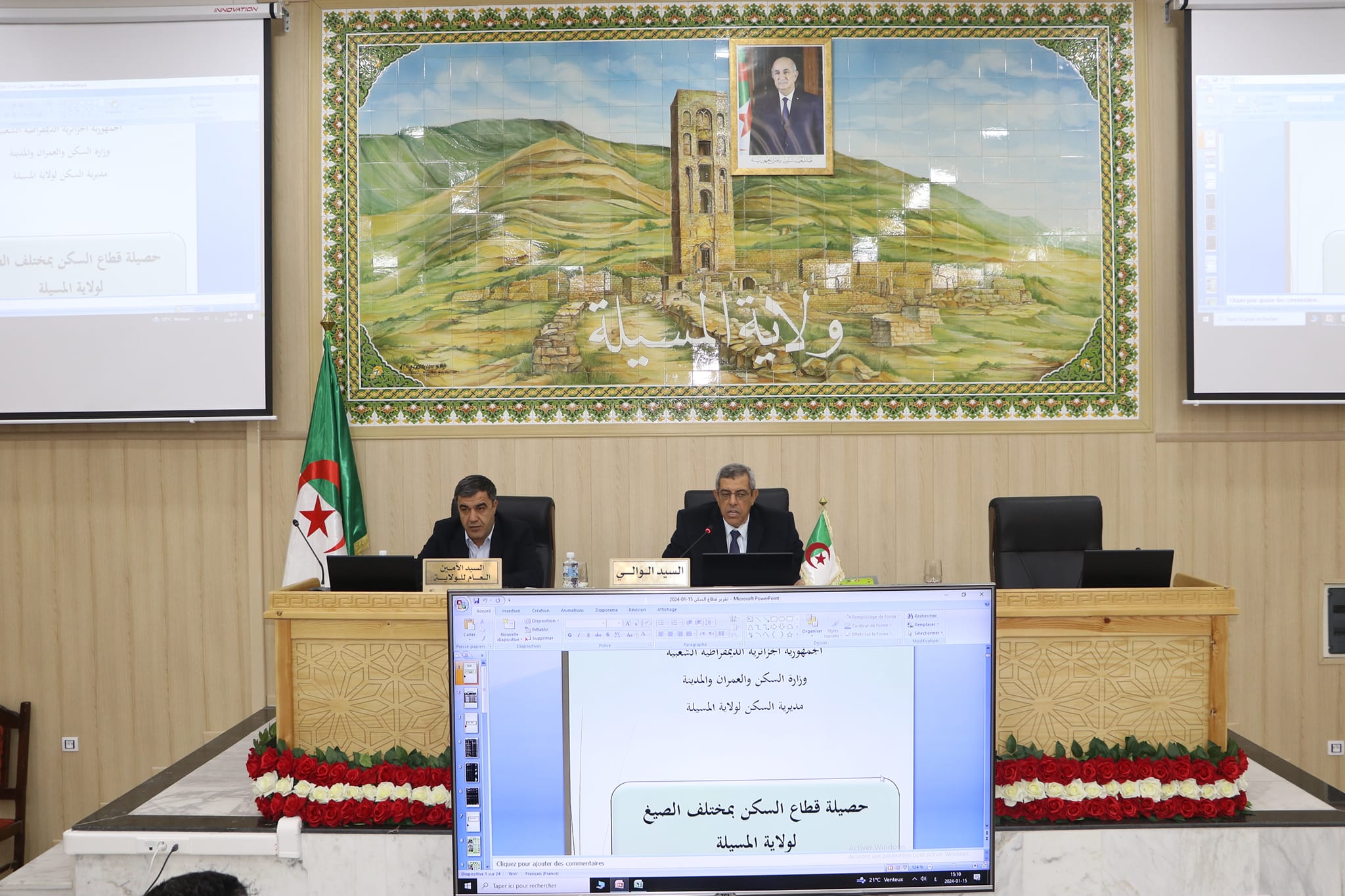 المسيلة/ ترأس مساء هذا اليوم الاثنين 15 جانفي 2024 السيد نجم الدين طيار والي الولاية اجتماعا بحضور السيد الوالي المنتدب لبوسعادة، السيد الأمين العام للولاية، وكل من السيدتين والسادة: مديرة السكن، مديرة أملاك الدولة، السيدة والسادة رؤساء الدوائر، مدير الادارة المحلية، مدير التعمير والهندسة المعمارية والبناء، مدير ديوان الترقية والتسيير العقاري، مدير مسح الأراضي والحفظ العقاري، مدير الموارد المائية، مدير الوكالة العقارية، مدير شركة توزيع الكهرباء والغاز بالمسيلة، مدير وحدة الجزائرية للمياه بالمسيلة، مدير وحدة ديوان التطهير بالمسيلة، مدير بنك الاسكان، رؤساء الأقسام الفرعية للسكن.