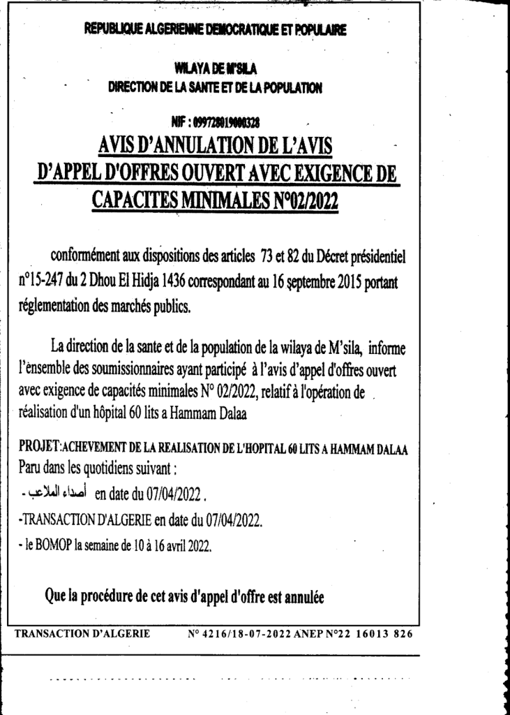 إشعار بإلغاء إشعار مناقصة مفتوحة: تكملة انجاز مستشفى 60 سرير بحمام الظلعة مديرية الصحة والسكان