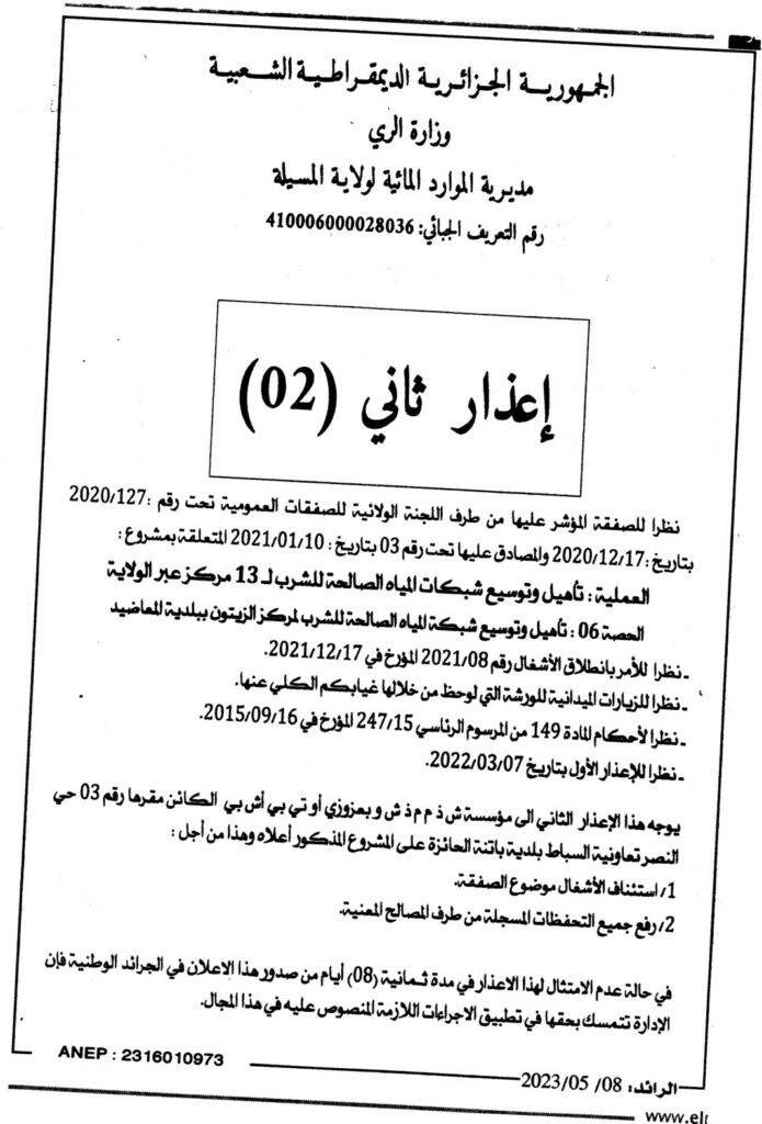 إعذار ثاني (02)/ مديرية الموارد المائية لولاية المسيلة