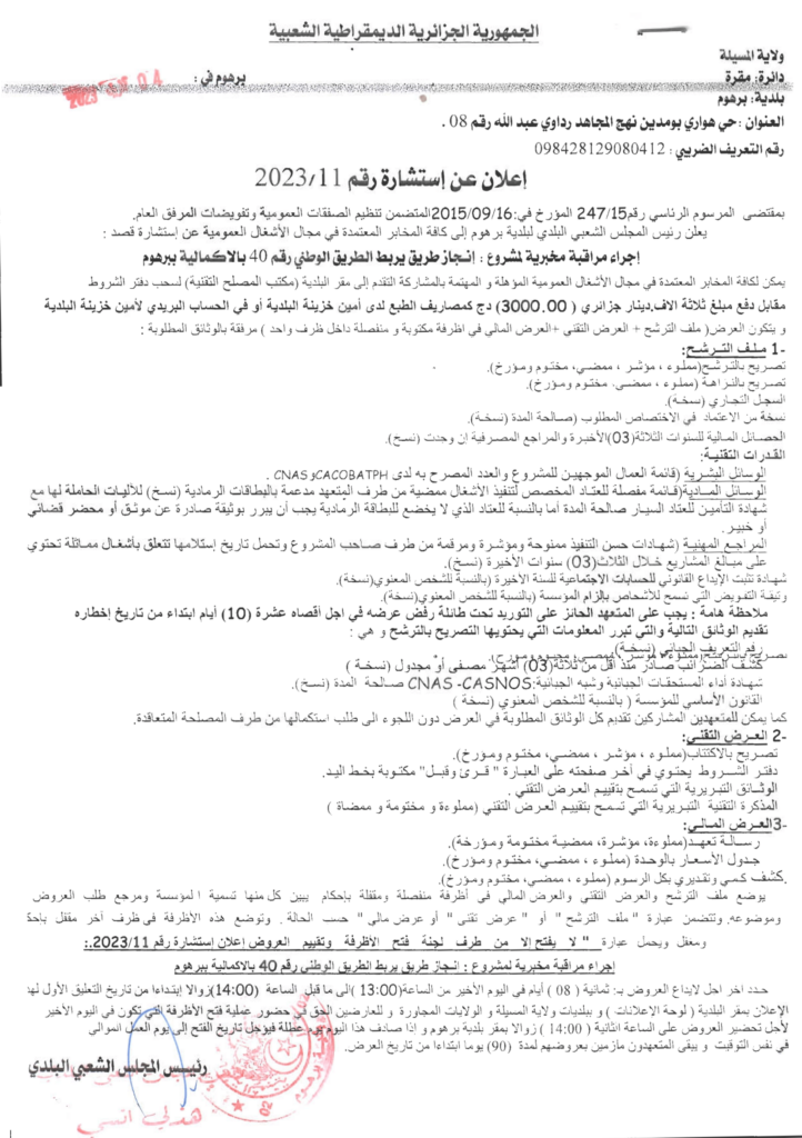 استشارة قصد: اجراء مراقبة مخبرية لمشروع: انجاز طريق يربط الطريق الوطني 40 بالاكمالية ببرهوم5 أبريل، 20230 24 شاركها فيسبوك X مشاركة عبر البريد طباعة