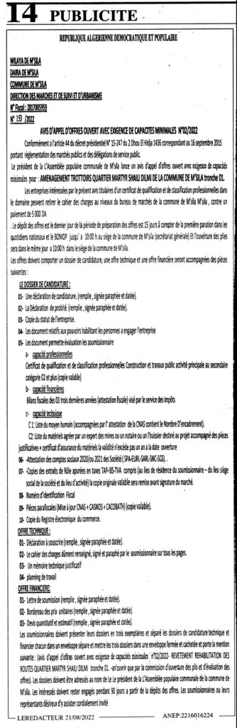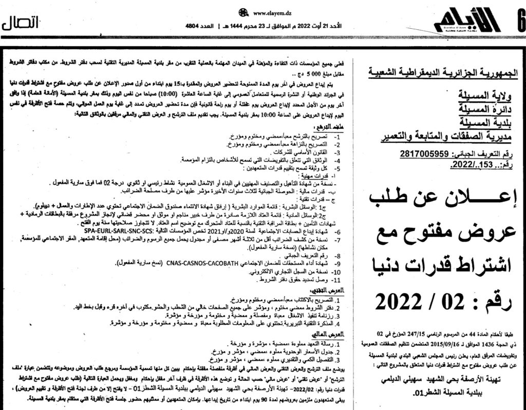 طلب عروض مفتوح مع اشتراط قدرات دنيا المتعلق بالمشروع تهيئة الأرصفة بحي الشهيد سهيلي الديلمي ببلدية المسيلة الشطر 0121 أغسطس، 20220 14 شاركها فيسبوك X مشاركة عبر البريد طباعة