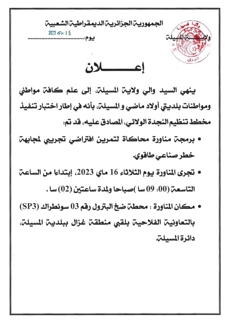 إعلان/ إنطلاق تطبيق محاكاة لتمرين إفتراضي تجريبي لمجابهة خطر صناعي طاقوي