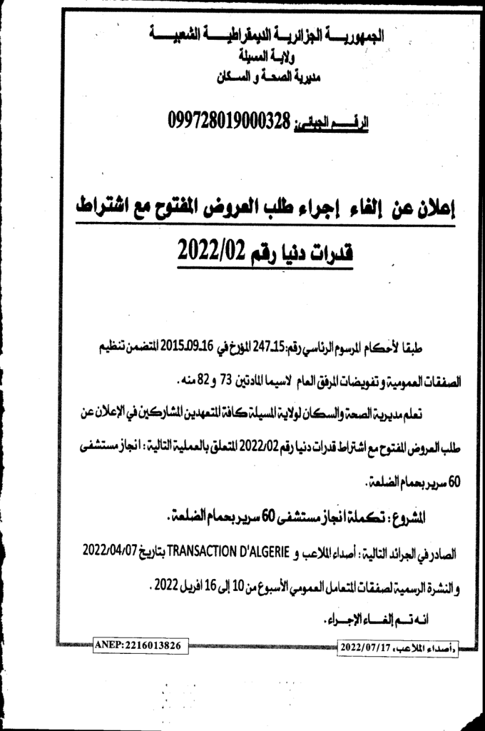 إعلان عن إلغاء إجراء طلب العروض المفتوح: تكملة انجاز مستشفى 60 سرير بحمام الظلعة مديرية الصحة والسكان