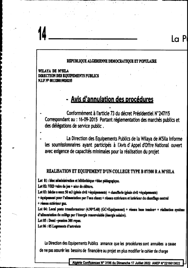 إعلان عن إلغاء الإجراءات:انجاز وتجهيز متوسطة نمط ب 300/07 وجبة ببلدية المسيلة مديرية التجهيزات العمومية