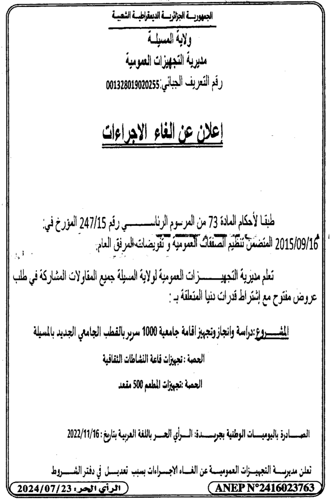 إعلان عن إلغاء الاجراءات/ مديرية التجهيزات العمومية لولاية المسيلة