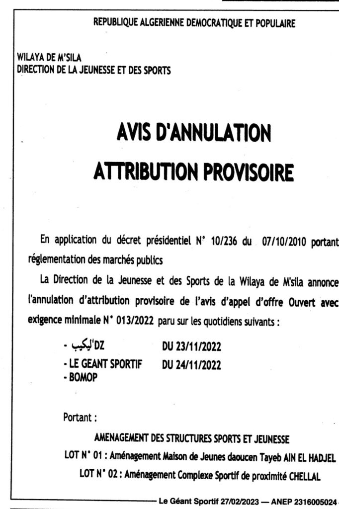 إعلان عن إلغاء المنح المؤقت/ مديرية الشباب والرياضة لولاية المسيلة