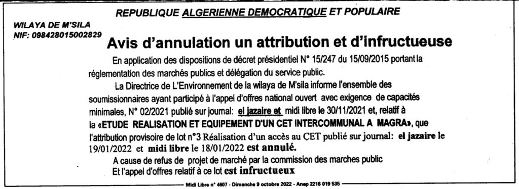 إعلان عن إلغاء منح مؤقت مديرية البيئة