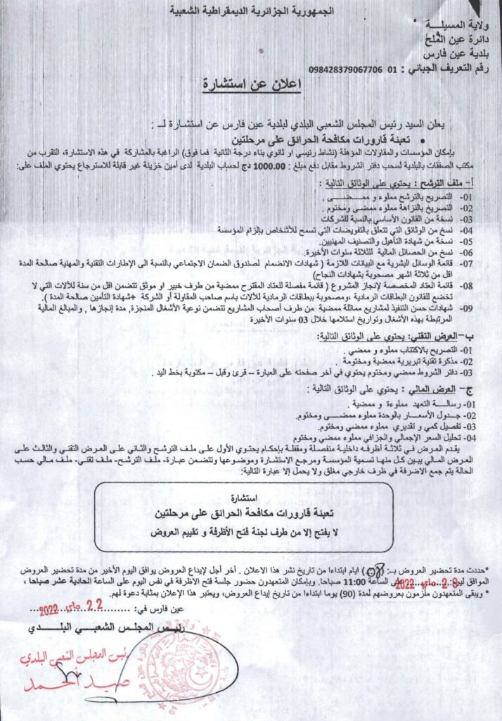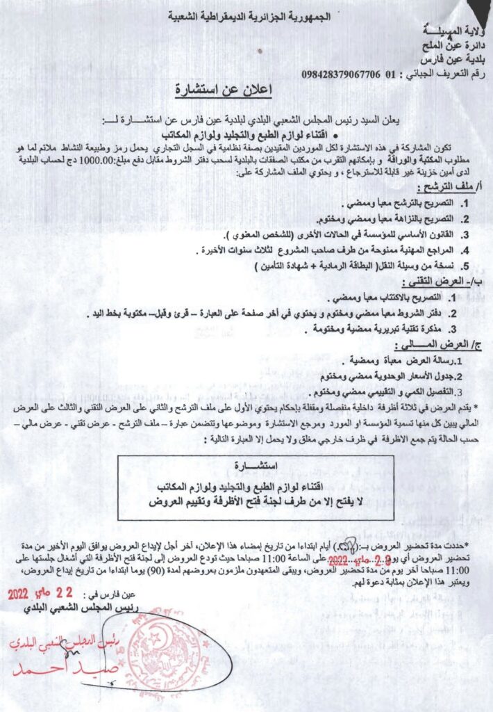 إعلان عن استشارات ليوم 22 ماي 2022 لبلدية عين فارس