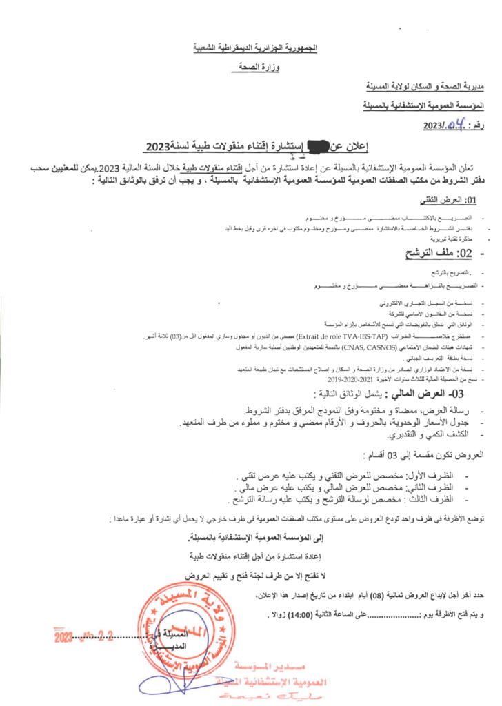 إعلان عن استشارة إقتناء منقولات طبية لسنة 2023 المؤسسة العمومية الاستشفائية المسيلة