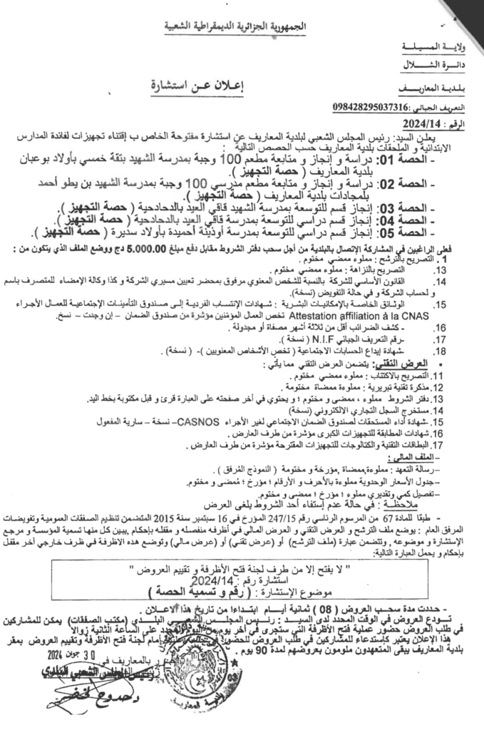 إعلان عن استشارة اقتناء تجهيزات لفائدة المدارس الابتدائية والملحقات بلدية المعاريف