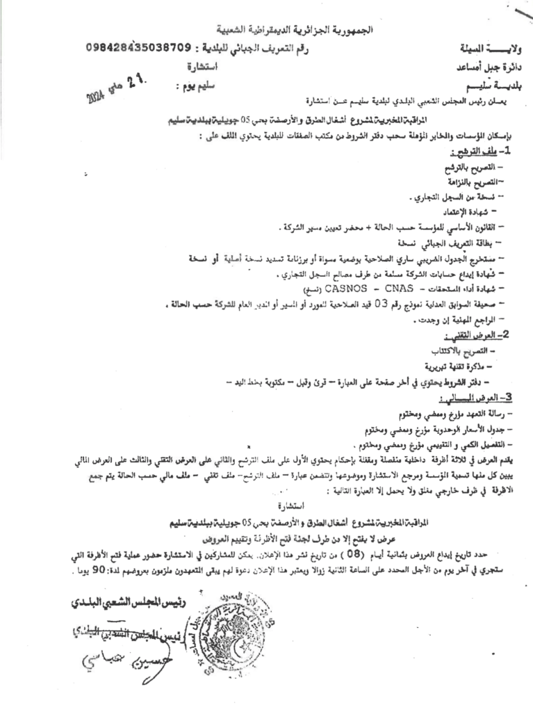 إعلان عن استشارة المراقبة المخبرية لمشروع أشغال الطرق والأرصفة بحي 05 جويلية ببلدية سليم