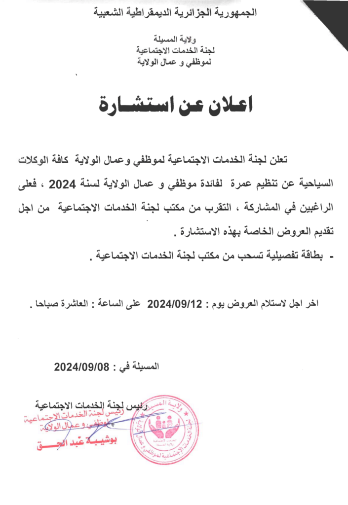 إعلان عن استشارة تنظيم عمرة لفائدة موظفي وعمال الولاية لسنة 2024/ لجنة الخدمات الاجتماعية لولاية المسيلة