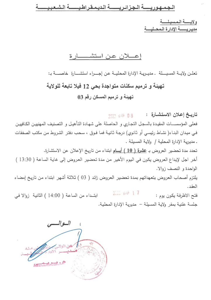 إعلان عن استشارة: تهيئة وترميم سكنات متواجدة بحي 12 فيلا تابعة للولاية / مديرية الادارة المحلية