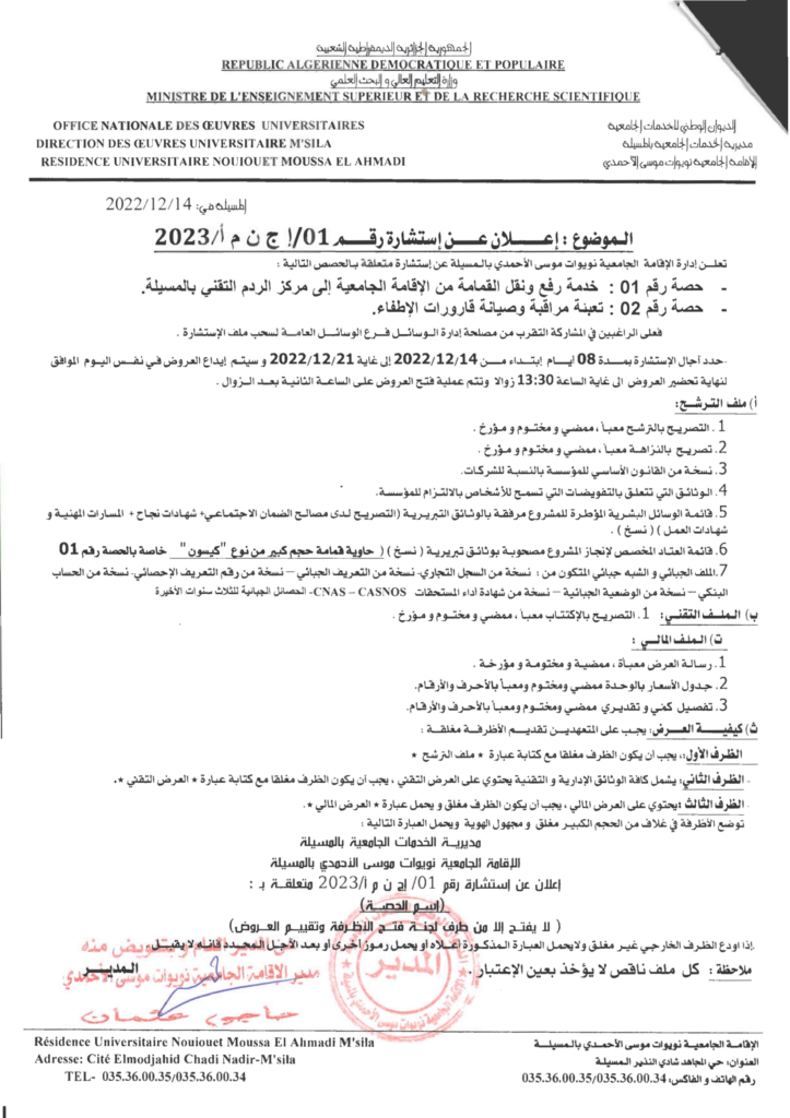 حصة رقم 01: خدمة رفع ونقل القمامة من الاقامة الجامعية إلى مركز الردم التقني بالمسيلةحصة رقم 02: تعبئة مراقبة وصيانة قارورات الإطفاء18 ديسمبر، 20220 69 شاركها فيسبوك X مشاركة عبر البريد طباعة