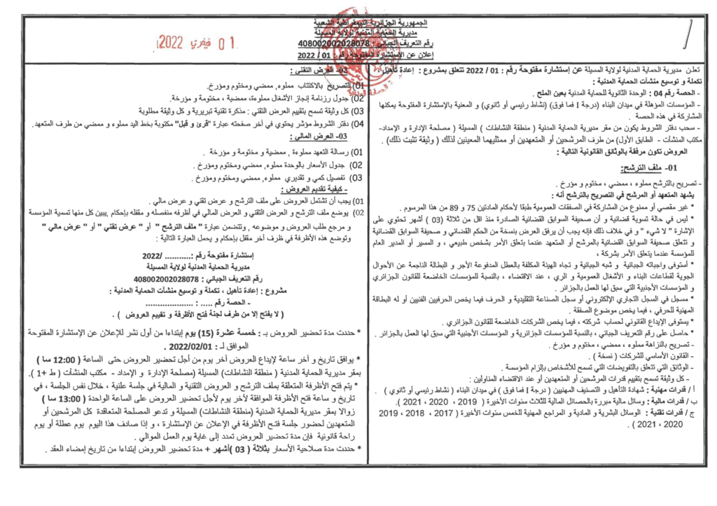 إعلان عن استشارة 2022/01: إعادة تأهيل تكملة وتوسيع منشآت الحماية المدنية / الوحدة الثانوية للحماية المدنية بعين الملح