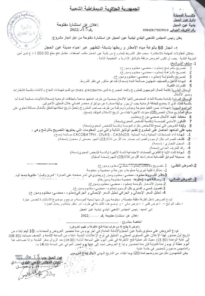 إعلان عن استشارة 2022/17: إنجاز 60 بالوعة مياه الأمطار وربطها بشبكة التطهير عبر أحياء بلدية عين الحجل
