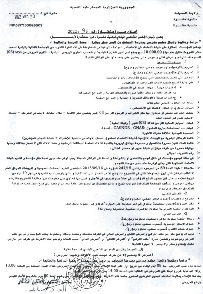 استشارة لأجل: دراسة ومتابعة وانجاز مطعم مدرسي بمدرسة المجاهد بن ناصر عمار بمقرة -حصة الدراسة والمتابعة-24 أكتوبر، 20220 8 شاركها فيسبوك X مشاركة عبر البريد طباعة