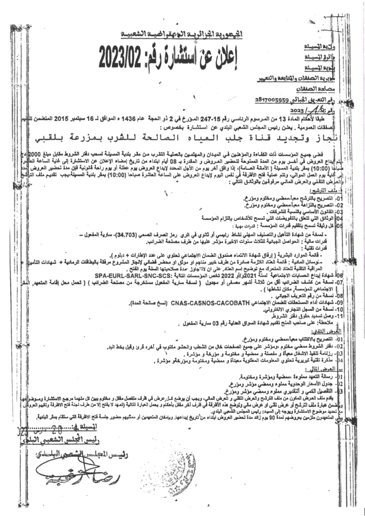 استشارة بخصوص: انجاز وتجديد قناة جلب المياه الصالحة للشرب بمزرعة بلقبي22 مارس، 20230 14 شاركها فيسبوك X مشاركة عبر البريد طباعة