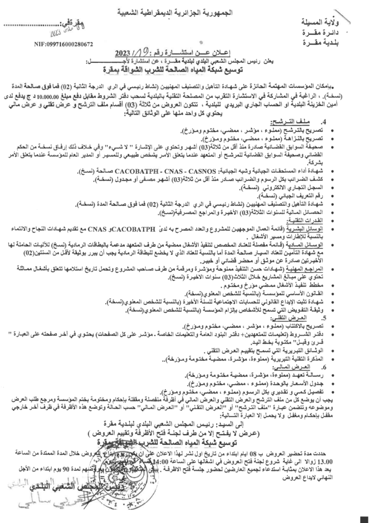 استشارة لأجل: توسيع شبكة المياه الصالحة للشرب الشواقة12 مارس، 20230 13 شاركها فيسبوك X مشاركة عبر البريد طباعة