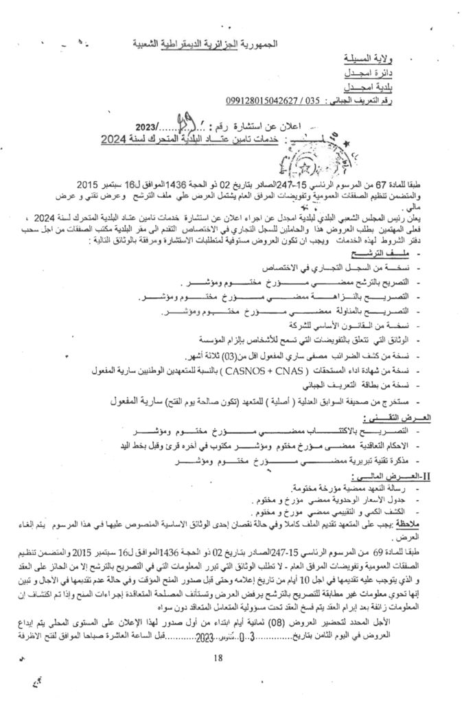 استشارة من أجل: خدمات تأمين عتاد البلدية المتحرك لسنة 20241 أكتوبر، 20230 11 شاركها فيسبوك X مشاركة عبر البريد طباعة