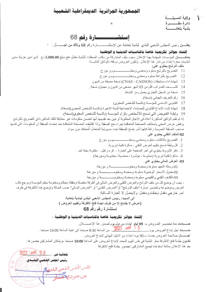 استشارة من أجل: اقتناء جوائز تكريمية خاصة بالمناسبات الدينية والوطنية9 أكتوبر، 20230 15 شاركها فيسبوك X مشاركة عبر البريد طباعة