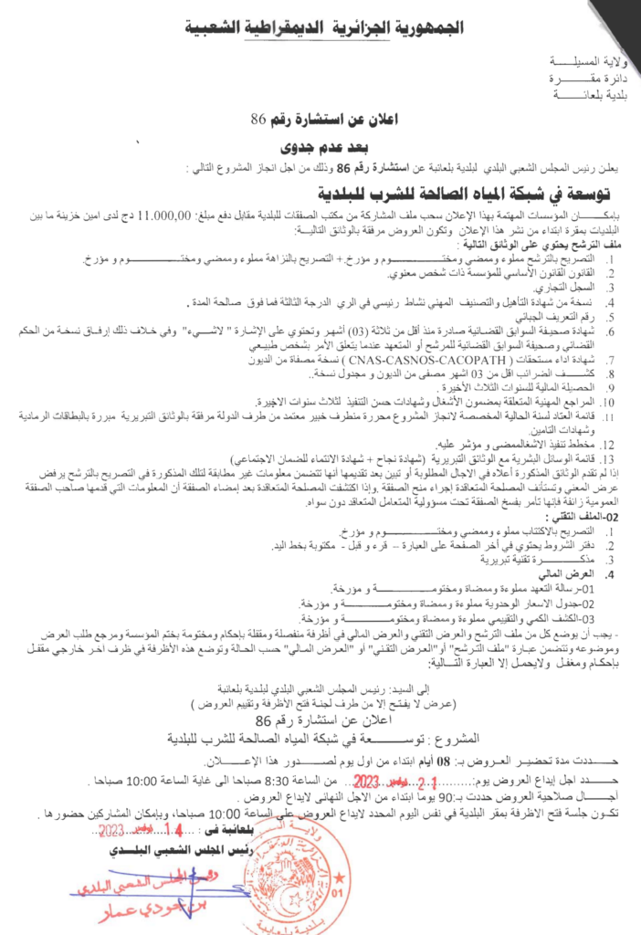 استشارة من أجل: توسعة في شبكة المياه الصالحة للشرب للبلدية15 نوفمبر، 20230 48 شاركها فيسبوك X مشاركة عبر البريد طباعة