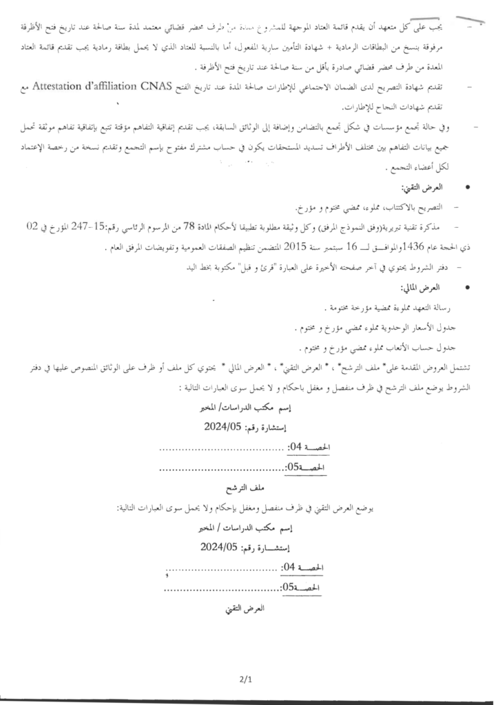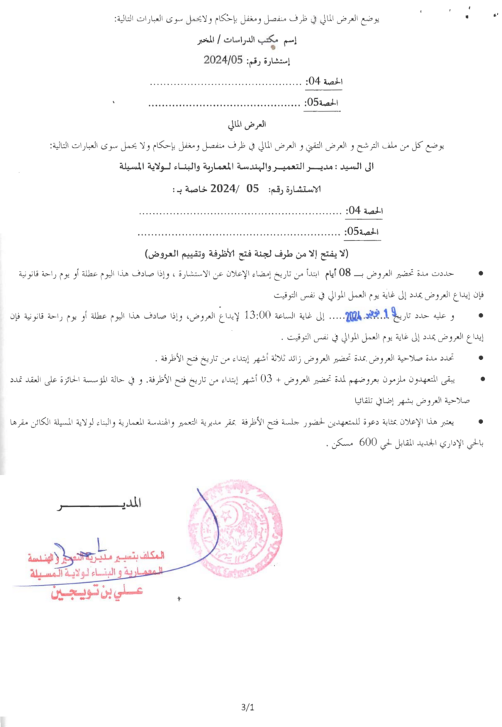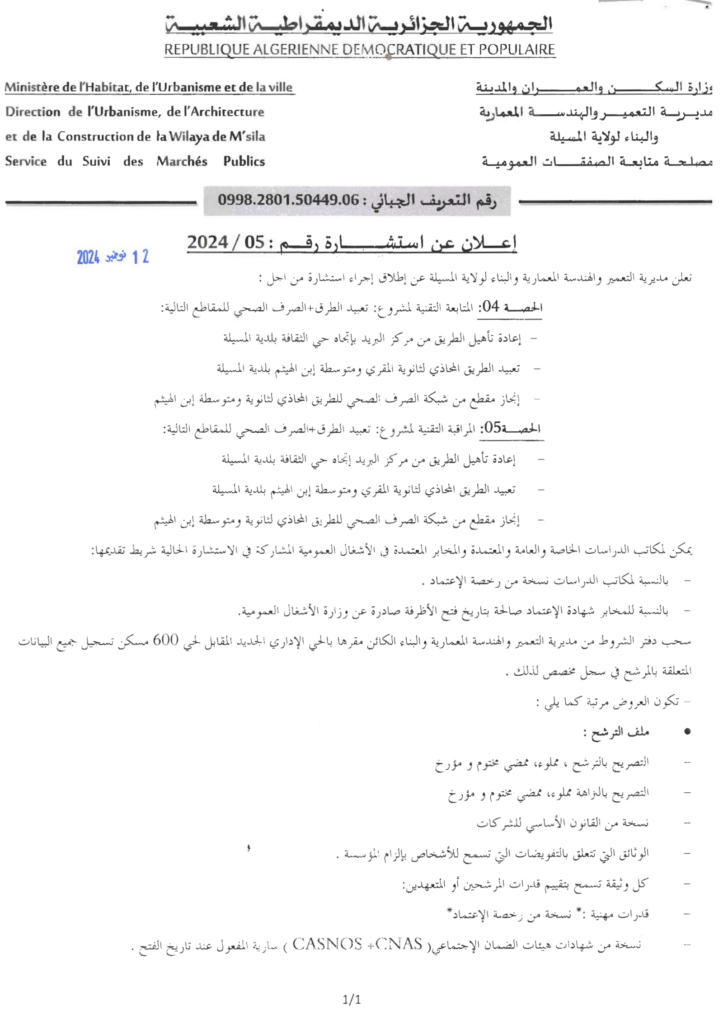 إعلان عن استشارة 2024/05 مديرية التعمير والهندسة المعمارية والبناء لولاية المسيلة