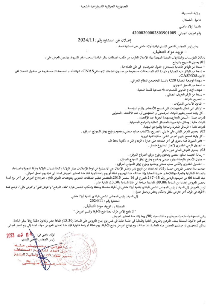 استشارة من أجل: توريد مواد التنظيف