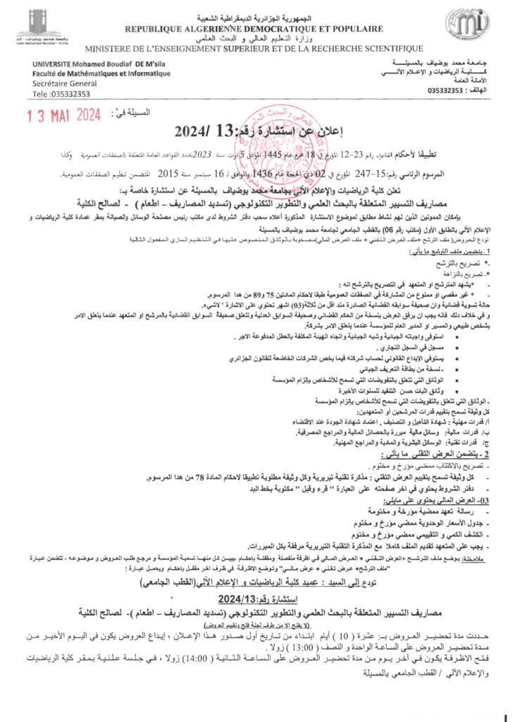 استشارة من أجل: مصاريف التسيير المتعلقة بالبحث العلمي والتطور التكنولوجي (تسديد المصاريف-اطعام) لصالح الكلية16 مايو، 20240 2 شاركها فيسبوك X مشاركة عبر البريد طباعة