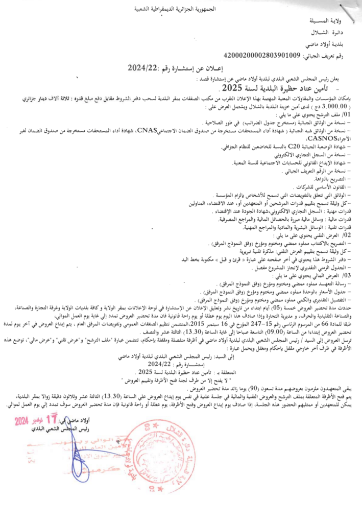 استشارة من أجل: تأمين عتاد حظيرة البلدية لسنة 202518 نوفمبر، 20240 0 شاركها فيسبوك X مشاركة عبر البريد طباعة