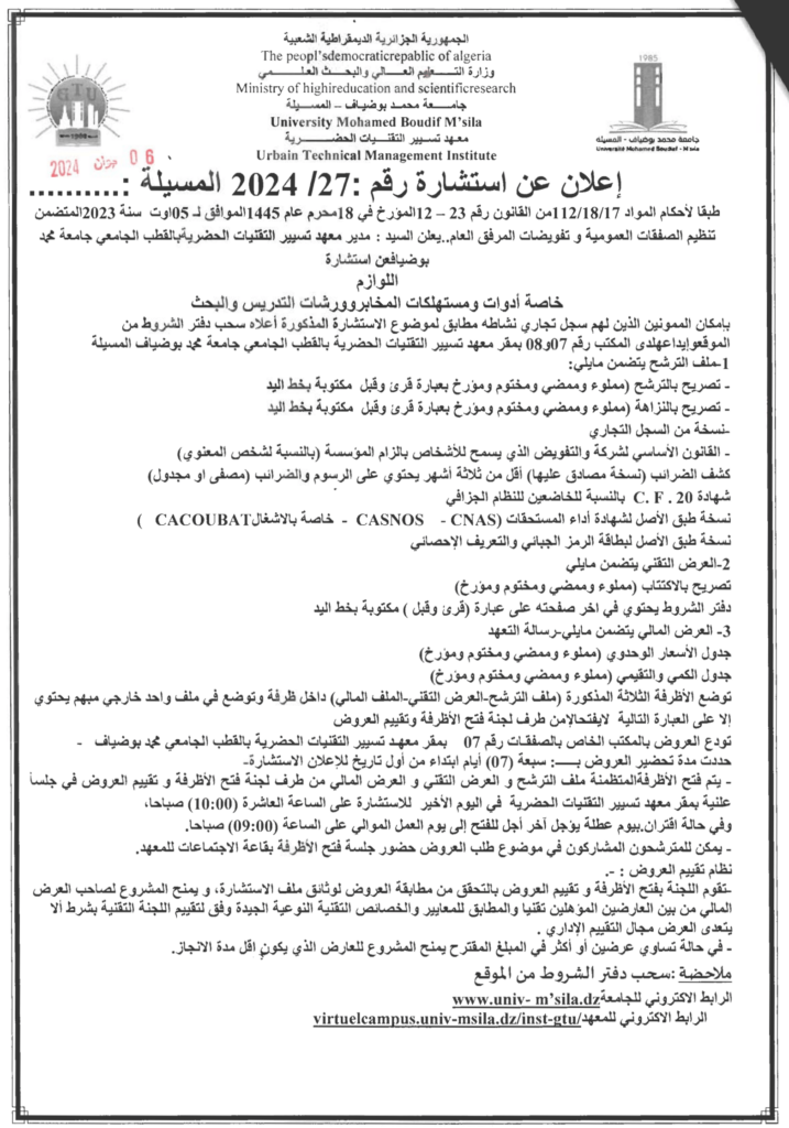 استشارة خاصة بأدوات ومستهلكات المخابر وورشات التدريس والبحث9 يونيو، 20240 4 شاركها فيسبوك X مشاركة عبر البريد طباعة