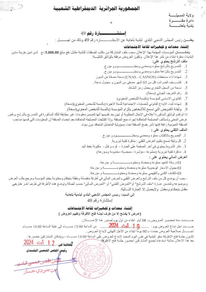 استشارة من أجل: اقتناء معدات وتجهيزات لقاعة الاجتماعات12 أغسطس، 20240 13 شاركها فيسبوك X مشاركة عبر البريد طباعة