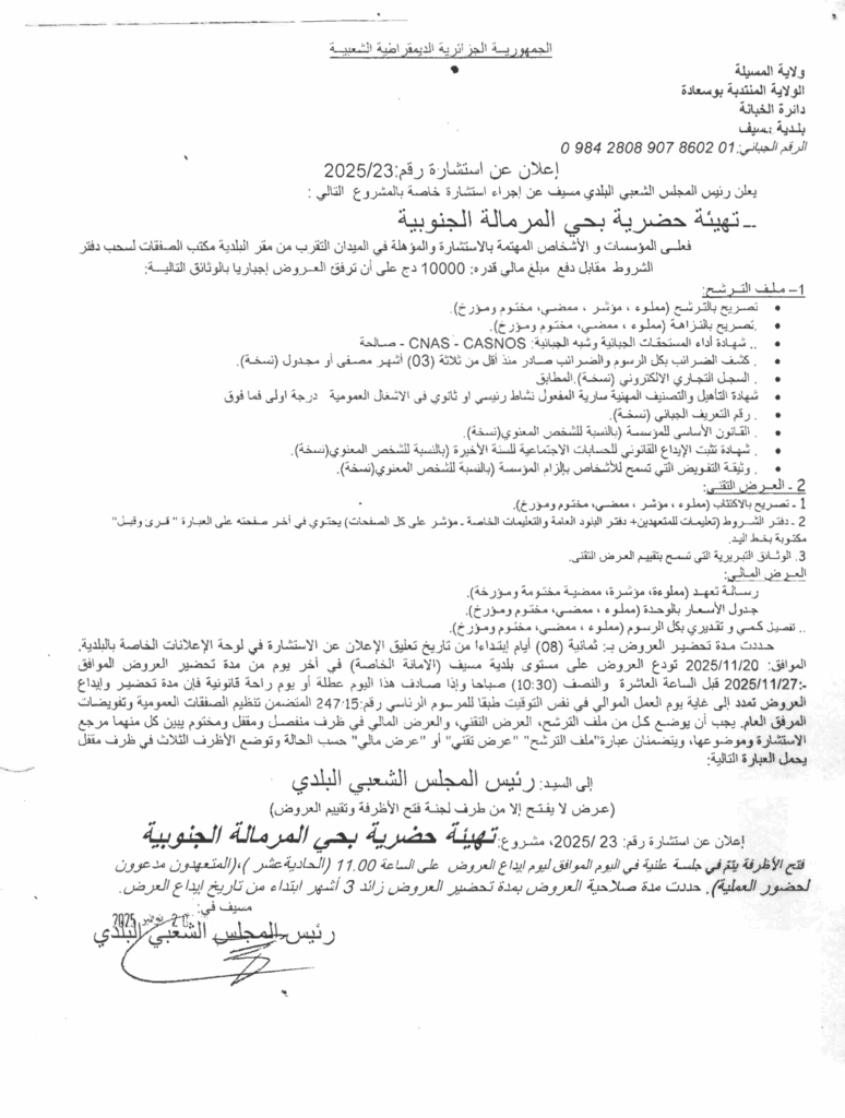 إعلان عن استشارة 2025/23 بلدية مسيف