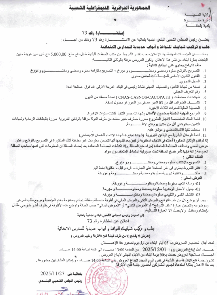 إعلان عن استشارة 2025/73 بلدية بلعايبة