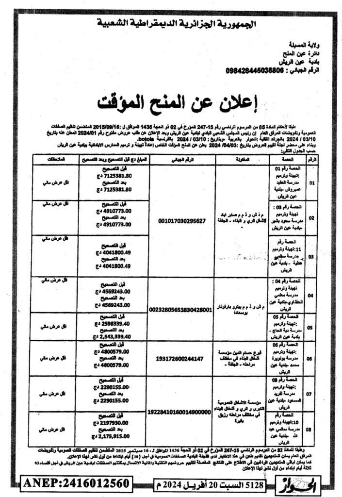 إعلان عن المنح المؤقت: إعادة تهيئة وترميم المدارس الابتدائية ببلدية عين الريش