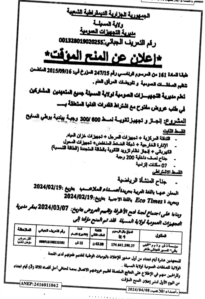 إعلان عن المنح المؤقت: انجاز وتجهيز ثانوية نمط 300/600 وجبة ببلدية بوطي السايح/ مديرية التجهيزات العمومية لولاية المسيلة