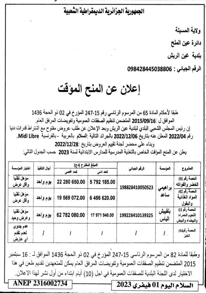 إعلان عن المنح المؤقت/ بلدية عين الريش