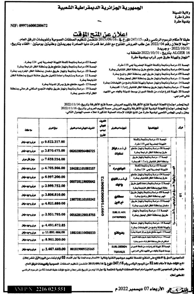 طلب عروض مفتوح مع اشتراط قدرات دنيا المتعلقة بـ : إنجاز وتهيئة طرق عبر تراب بلدية مقرة7 ديسمبر، 20220 24 شاركها فيسبوك X مشاركة عبر البريد طباعة