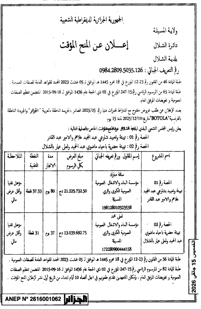 إعلان عن المنح المؤقت تهيئة وتعبيد الشارع/ بلدية الشلال