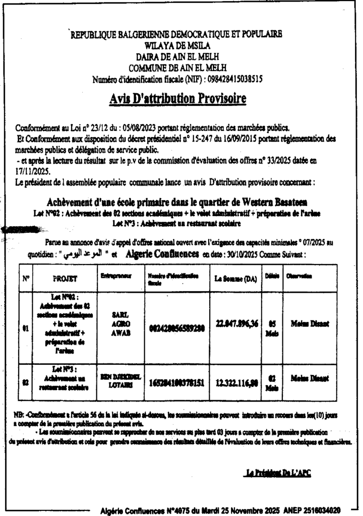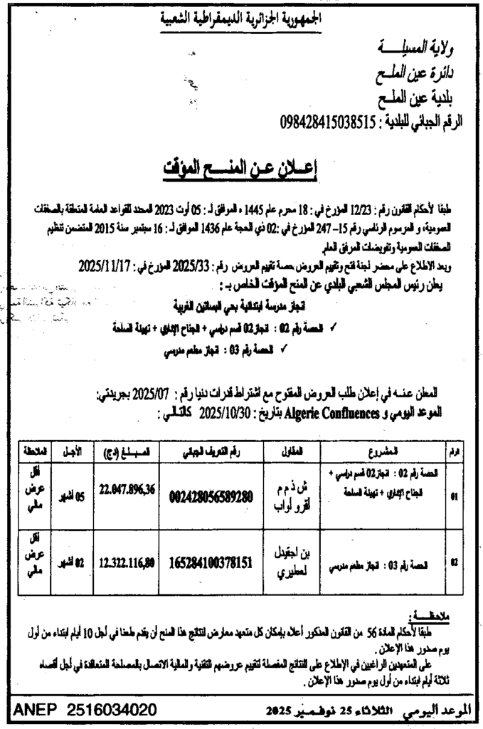 إعلان عن المنح المؤقت لصفقة انجاز مدرسة ابتدائية بحي البساتين الغربية/ بلدية عين الملح