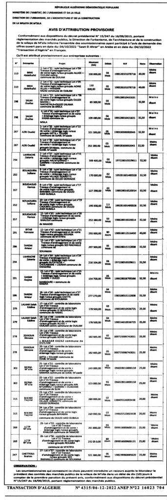 إعلان عن المنح المؤقت مديرية التعمير و الهندسة المعمارية