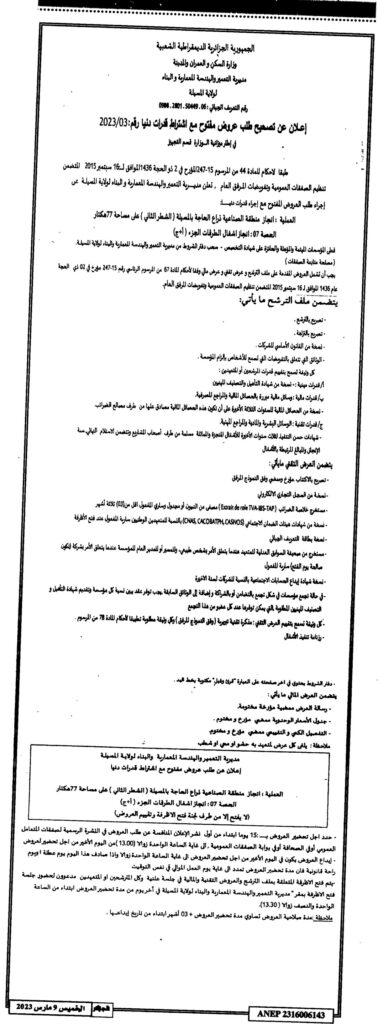 إعلان عن تصحيح طلب عروض مفتوح 2023/03 مديرية التعمير والهندسة المعمارية والبناء لولاية المسيلة