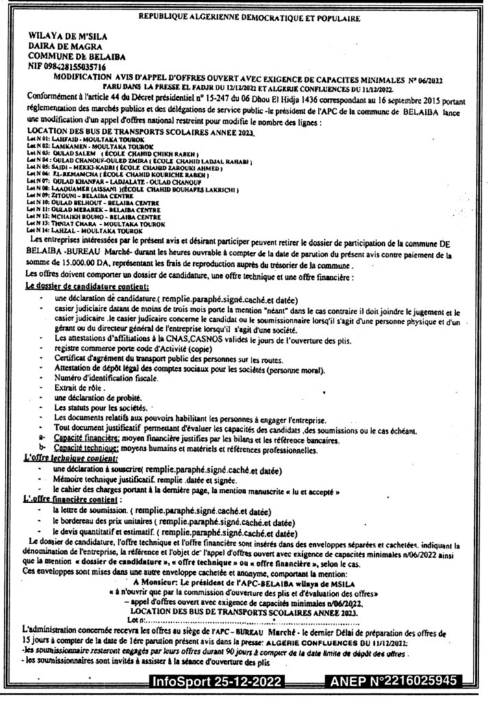 إعلان عن تعديل طلب العروض المفتوح 2022/06 بلدية بلعايبة