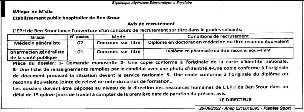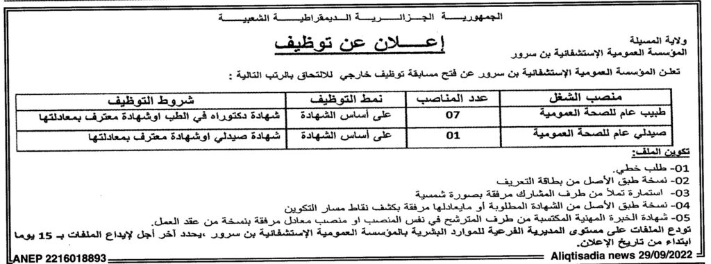 إعلان عن توظيف المؤسسة العمومية الإستشفائية بن سرور