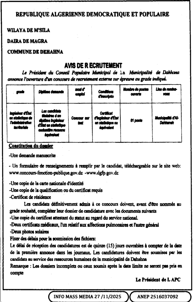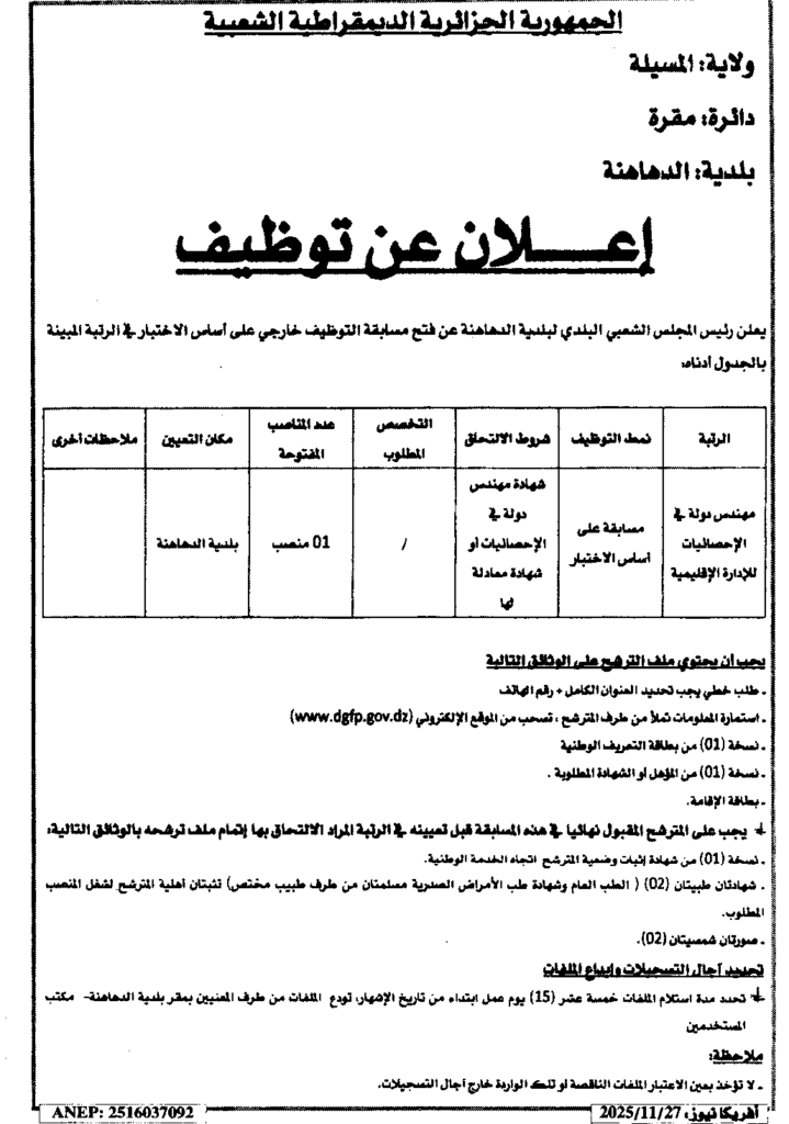 إعلان عن توظيف مهندس دولة في الاحصائيات/ بلدية الدهاهنة