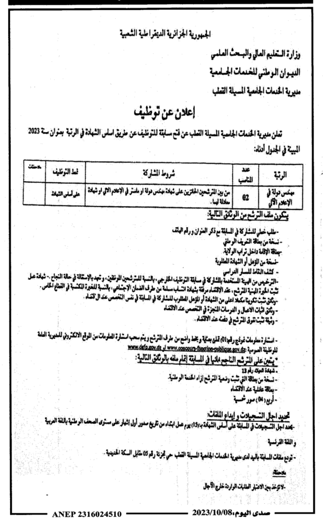 إعلان عن توظيف: مهندس دولة في الاعلام الآلي/ مديرية الخدمات الجامعية المسيلة القطب