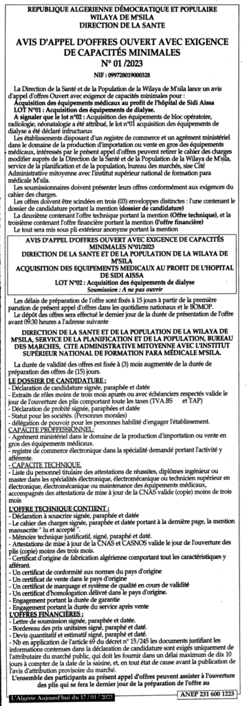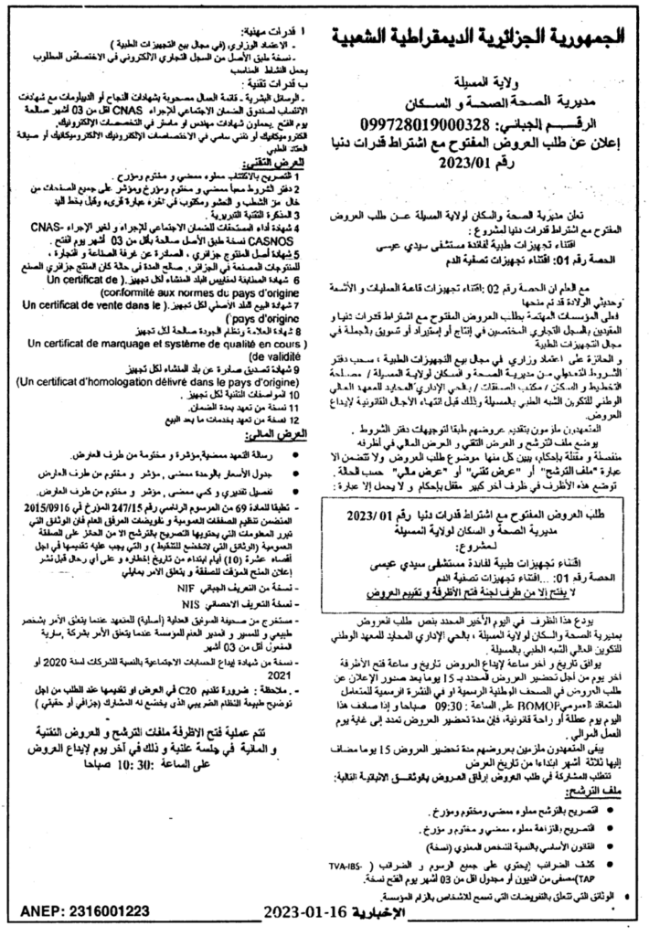 طلب العروض المفتوح مع اشتراط قدرات دنيا لمشروع: اقتناء تجهيزات طبية لفائدة مستشفى سيدي عيسىالحصة رقم 01: اقتناء تجهيزات تصفية الدم.16 يناير، 20230 11 شاركها فيسبوك X مشاركة عبر البريد طباعة