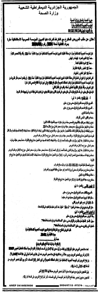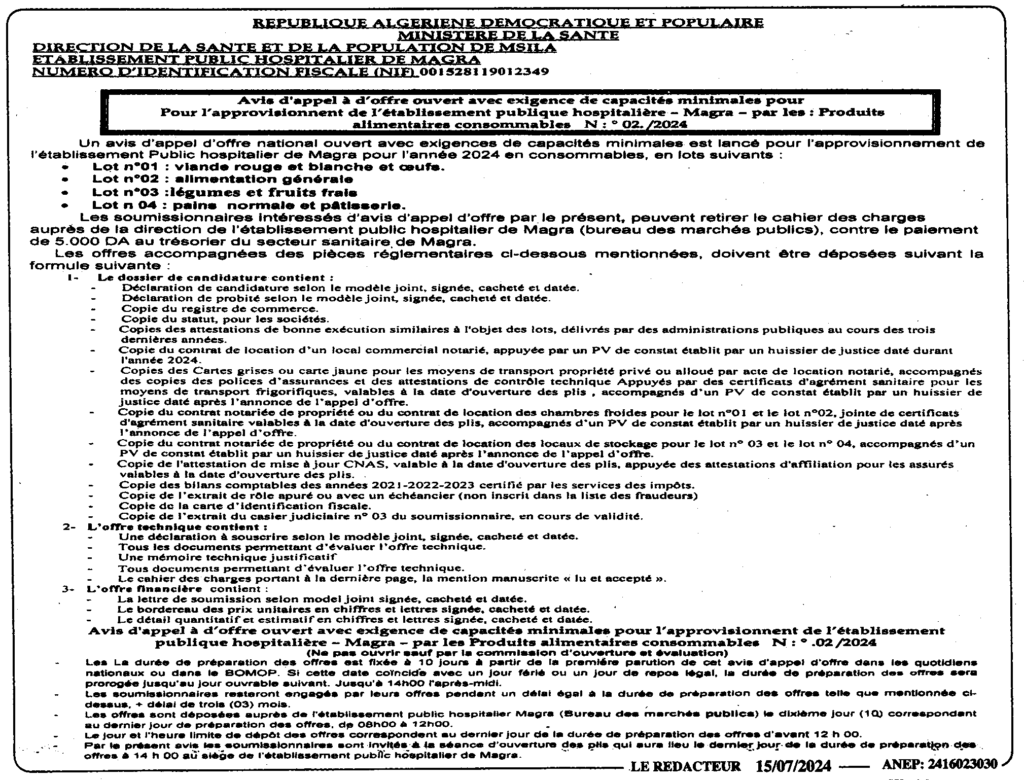 إعلان عن طلب العروض المفتوح 2024/02 لتموين المؤسسة الاستشفائية مقرة بمواد التغذية لسنة 2024