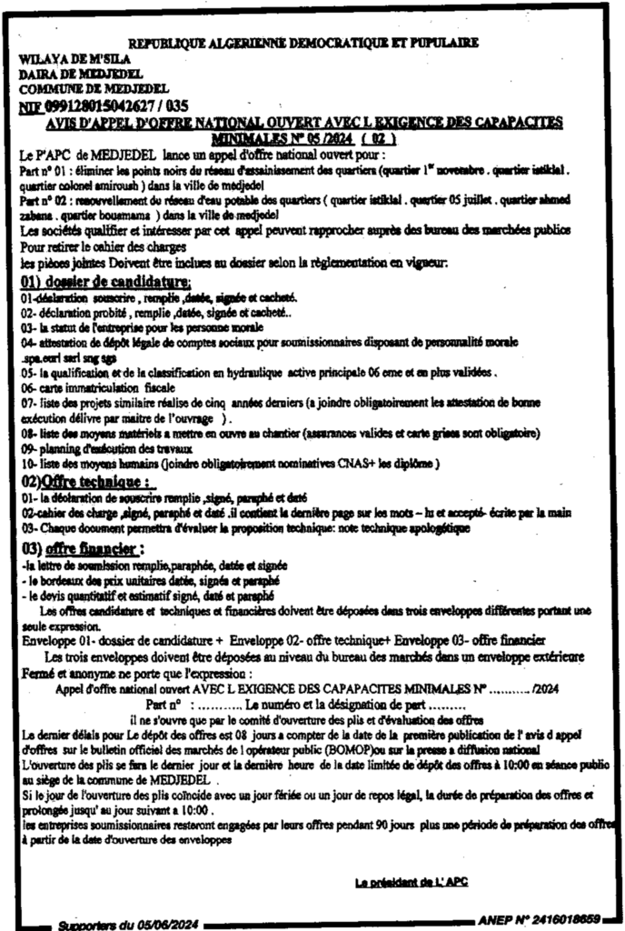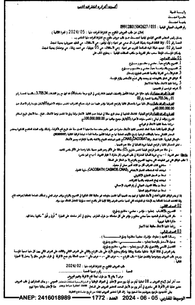 إعلان عن طلب العروض المفتوح 2024/05 بلدية امجدل