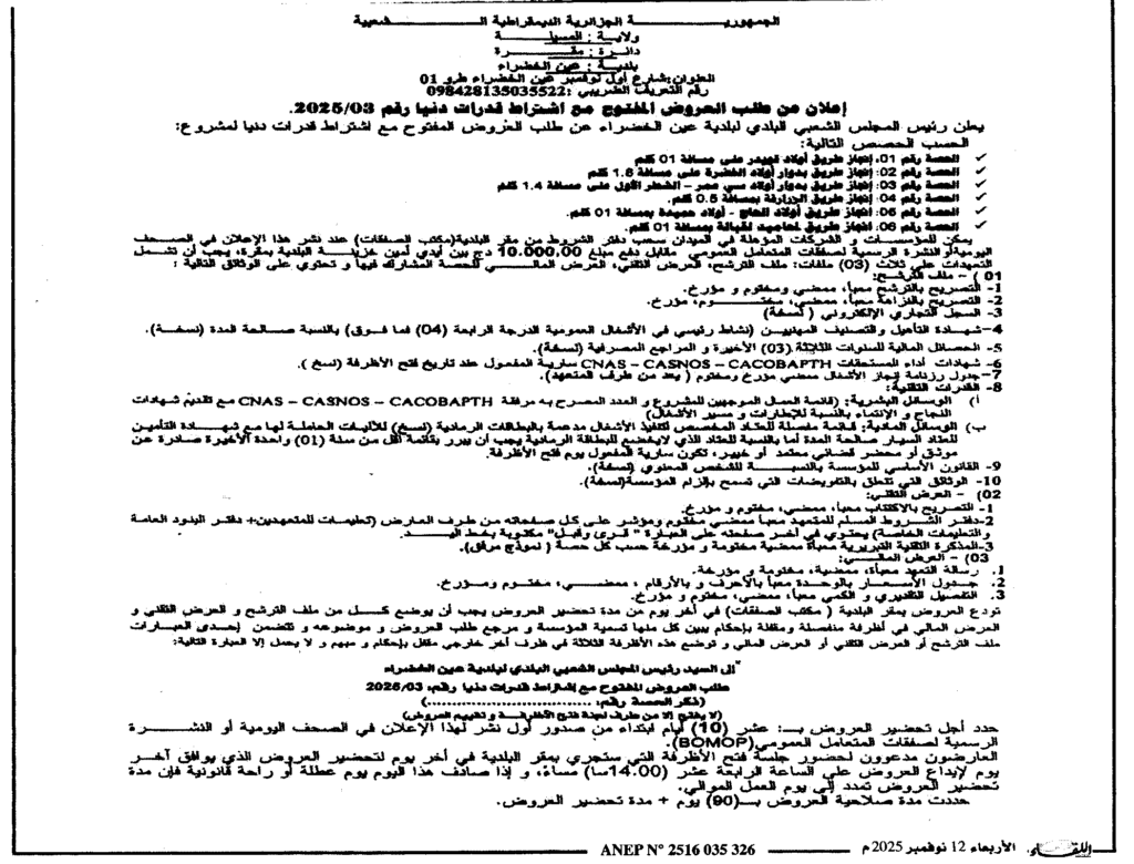 إعلان عن طلب العروض المفتوح 2025/03 بلدية عين الخضراء